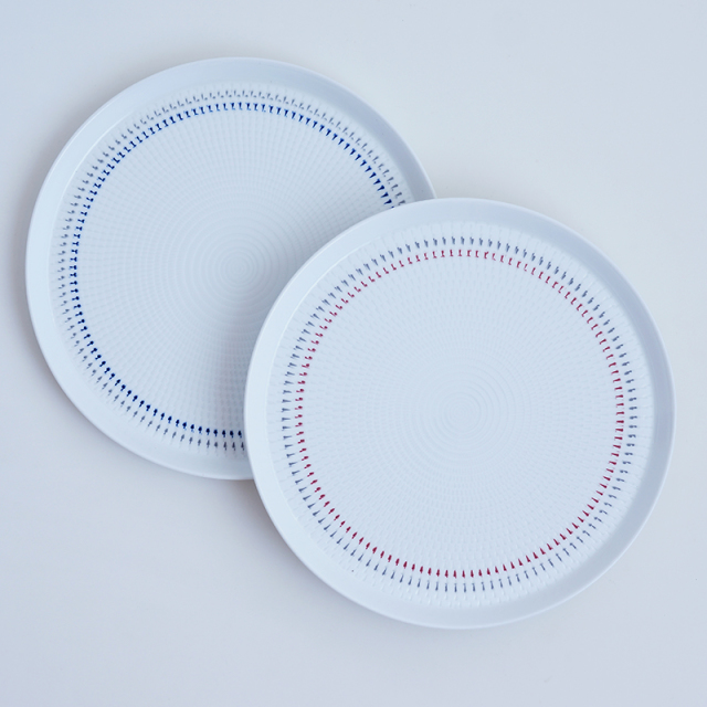 真っ白な白磁とカンナ彫した部分の2色のライン(グレーと青or赤)のコントラストがお洒落れで、プラス職人の削り加工の技も実感できます。